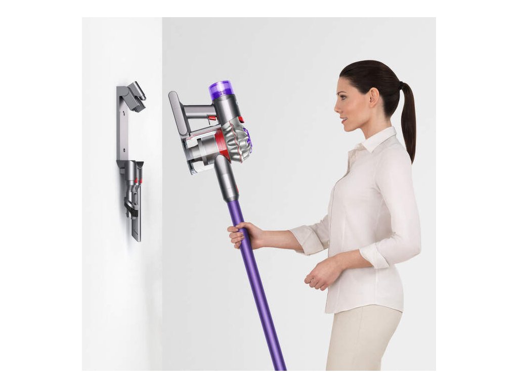Vysávač Dyson V8 sa zasúva do úchytu na stene, ktorý slúži na nabíjanie vysávača aj úhľadnému uloženiu príslušenstva. Jedná sa o praktické riešenie, ktoré je vždy po ruke. - Vysávanie schodov