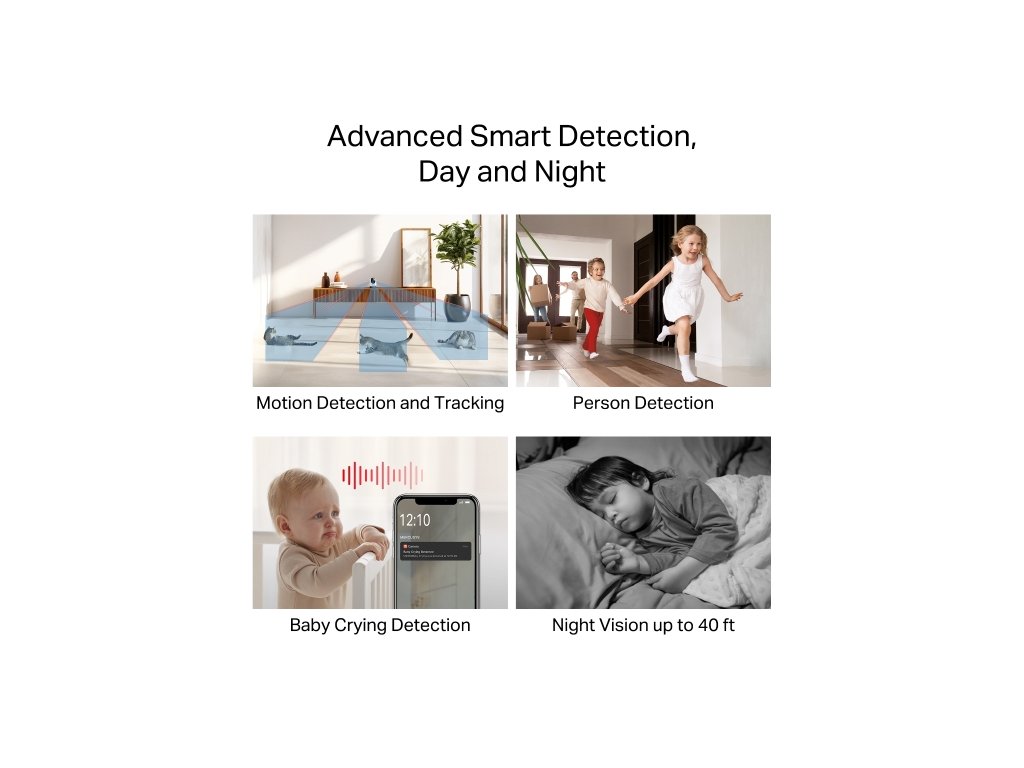Inteligentné detekcie - Nepretržitá detekcia pohybu, rozpoznávanie osôb a detekcia plaču dieťaťa s okamžitými upozorneniami. Podporuje nastavenie aktívnych zón.