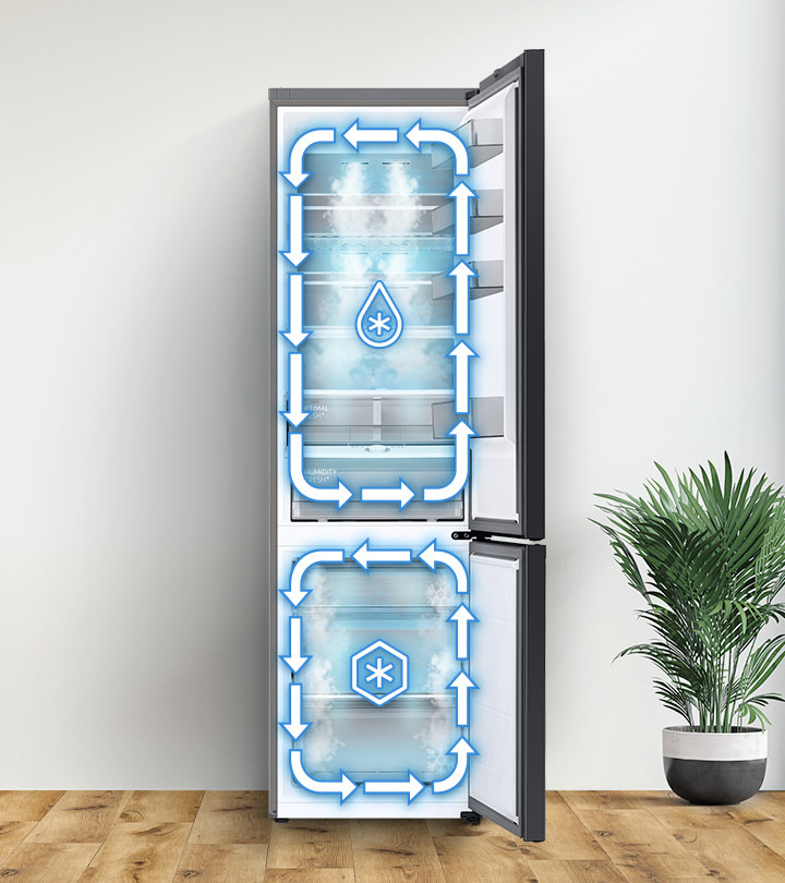 Dajte zbohom nepríjemnému miešaniu pachov. Vďaka sofistikovanému riešeniu nezávislého chladenia Twin Cooling Plus bude v chladničke aj mrazničke vzduch prúdiť v uzavretých okruhoch, takže vaše uložené pochutiny zostanú dlhšie čerstvé a šťavnaté – bez toho, aby vzájomne preberali svoju arómu. Systém praktických výparníkov a ventilátorov pracuje tak, aby sa každá položka uložená v policiach chladila rovnomerne a dostala sa jej starostlivosť v podobe kombinácie optimálnej vlhkosti a chladu.