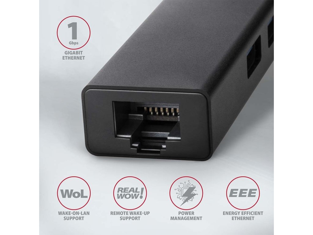 Štíhly kovový USB 3.2 Gen 1 (USB 3.0) multi-port hub AXAGON HMA-GL3A nielen pripojí k notebooku alebo počítaču až tri USB zariadení súčasne, ale pridá aj gigabitovú sieťovú kartu, ktorá pripojí váš počítač k vysokorýchlostnej sieti.