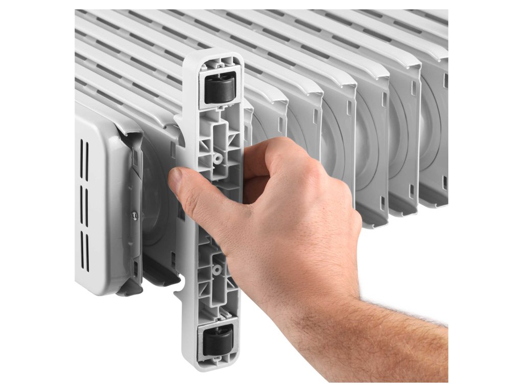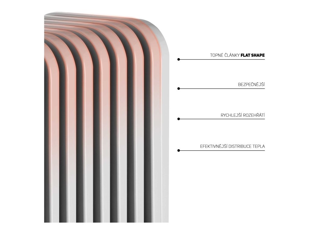 - nový dizajn ohrievacích článkov FLAT SHAPE ponúka pri kompaktnejších rozmeroch kúrenia väčšiu plochu na odovzdávanie tepla. Pre rovnaký tepelný výkon tak môže byť teplota povrchu nižšia. Zároveň optimalizácia vedenia ohrievacích kanálikov, ktorými prúdi nahrievaný olej, urýchľuje prvotné prehriatie radiátora. Rýchlejšie sa tak prehreje aj vyhrievaná miestnosť a zahrejete sa aj vy.