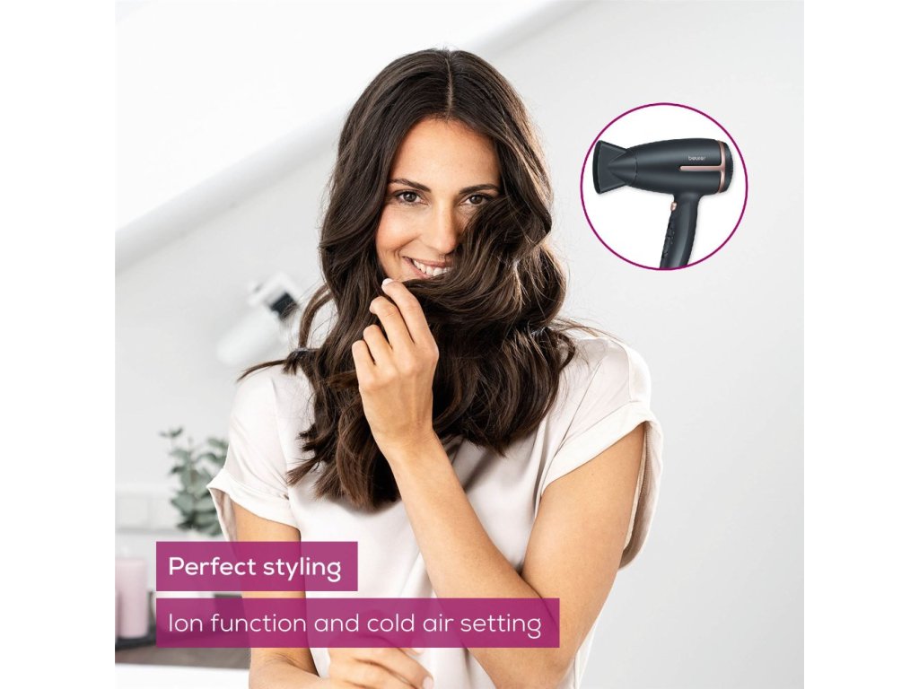 2 úrovne tepla a dve nastavenia rýchlosti sa prispôsobia vašim potrebám a tak zabezpečujú dlhotrvajúci styling. Fén sa dodáva sa aj s úzkou profesionálnou tryskou. Disponuje tiež automatickou ochranou proti prehriatiu. Má odnímateľný bezpečnostný filter - pre jednoduché čistenie a tiež mäkký dotykový povrch a slučku pre zavesenie a ľahké ukladanie.