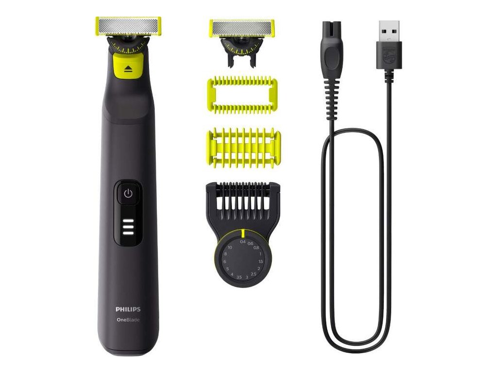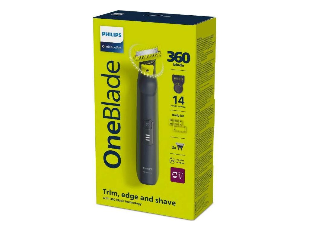 Súčasťou balenia sú 2 inovatívne čepele Philips OneBlade 360, ktoré disponujú otočným kĺbom umožňujúcim optimálny kontakt s pokožkou. Tvár aj telo upravíte veľmi rýchlo. Ďalej balenie obsahuje ochranné puzdro na čepeľ a USB-A kábel na nabíjanie. Adaptér nie je súčasťou balenia.