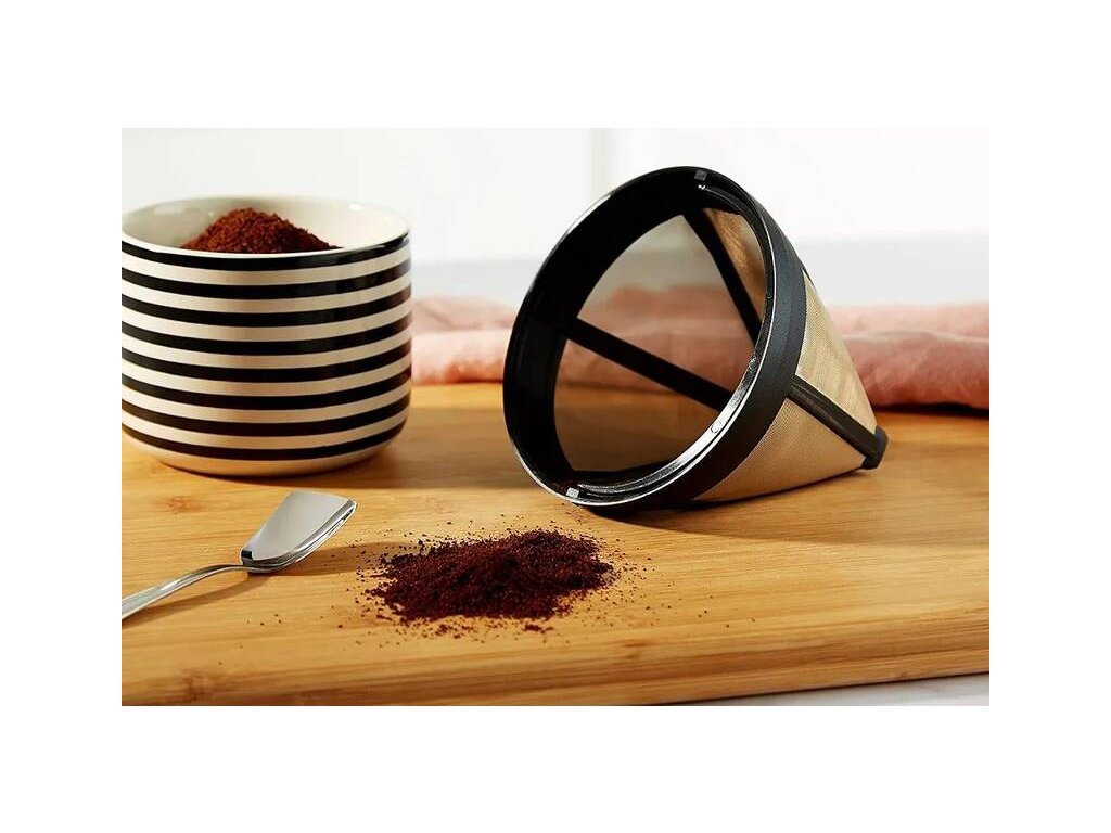 Permanentný kávový filter Scanpart SCA 2790000411 veľkosť 4 je revolučné riešenie pre všetkých milovníkov kávy hľadajúcich autentickú a plnú chuť svojho obľúbeného nápoja bez použitia jednorazových papierových filtrov. Vyrobený je z nerezovej sieťoviny potiahnutej 23-karátovou zlatou fóliou a pýši sa výnimočnou kvalitou a dizajnom, čo prispieva k ešte lepšiemu zážitku z pitia kávy. Zlato je materiál, ktorý je úplne neutrálny na chuť kávy, a preto nie je ovplyvnená žiadnymi vonkajšími faktormi. Vďaka tomu je chuť vašej kávy čistejšia, plnšia a viac aromatická.