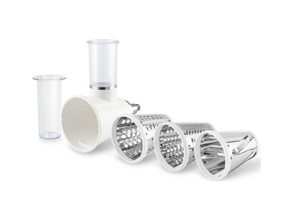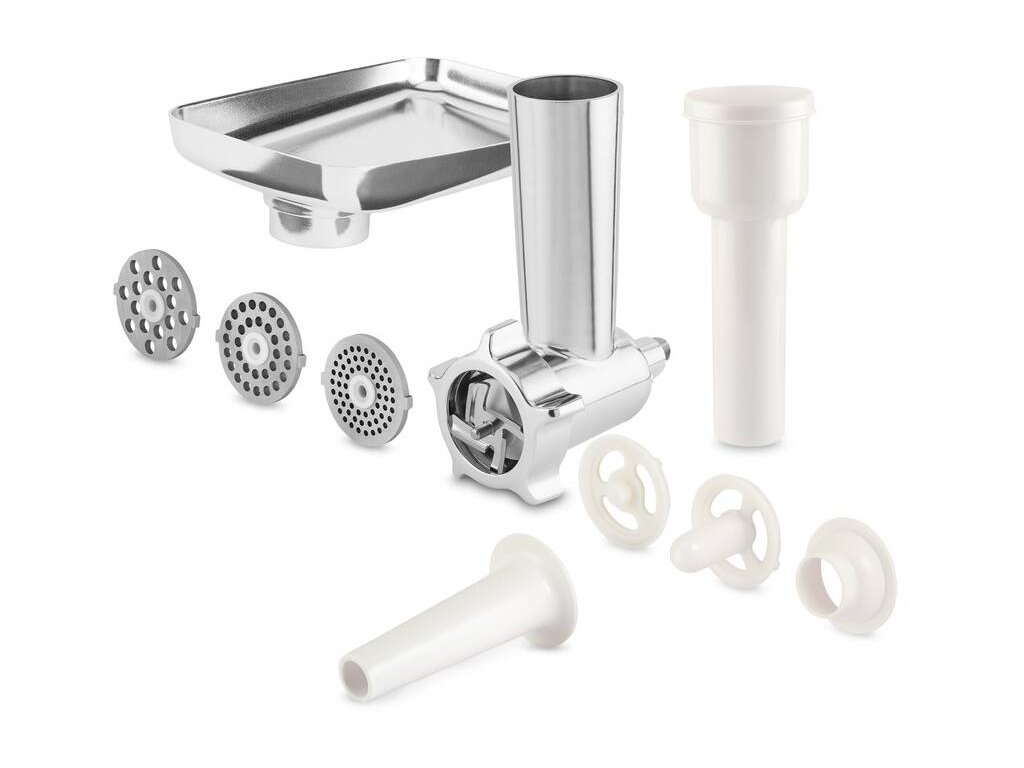 Súčasťou balenia tohto kuchynského robota je aj súprava príslušenstva pre jeho multifunkčné využitie. Konkrétne v súprave nájdete misu, hnetací hák, plochú metlu, balónovú metlu, mlynček na mäso, nadstavec na údeniny a jemné, hrubé aj plátkovacie strúhadlo.