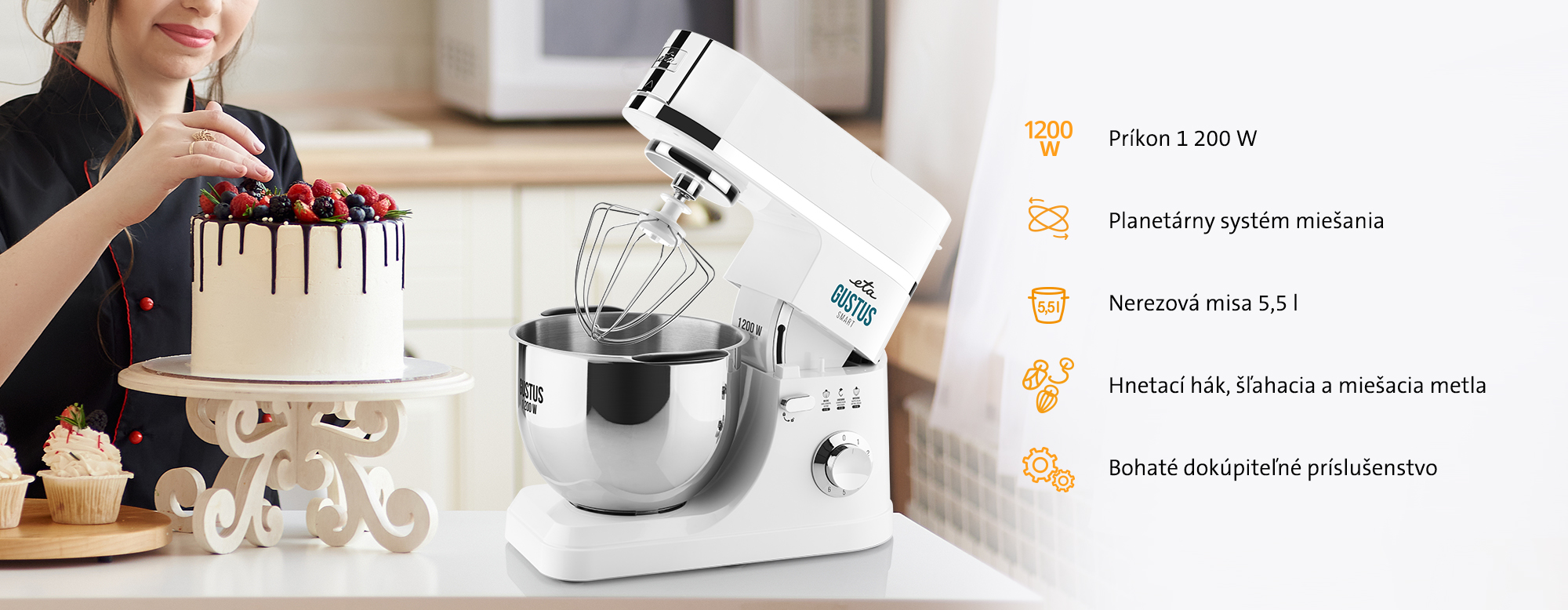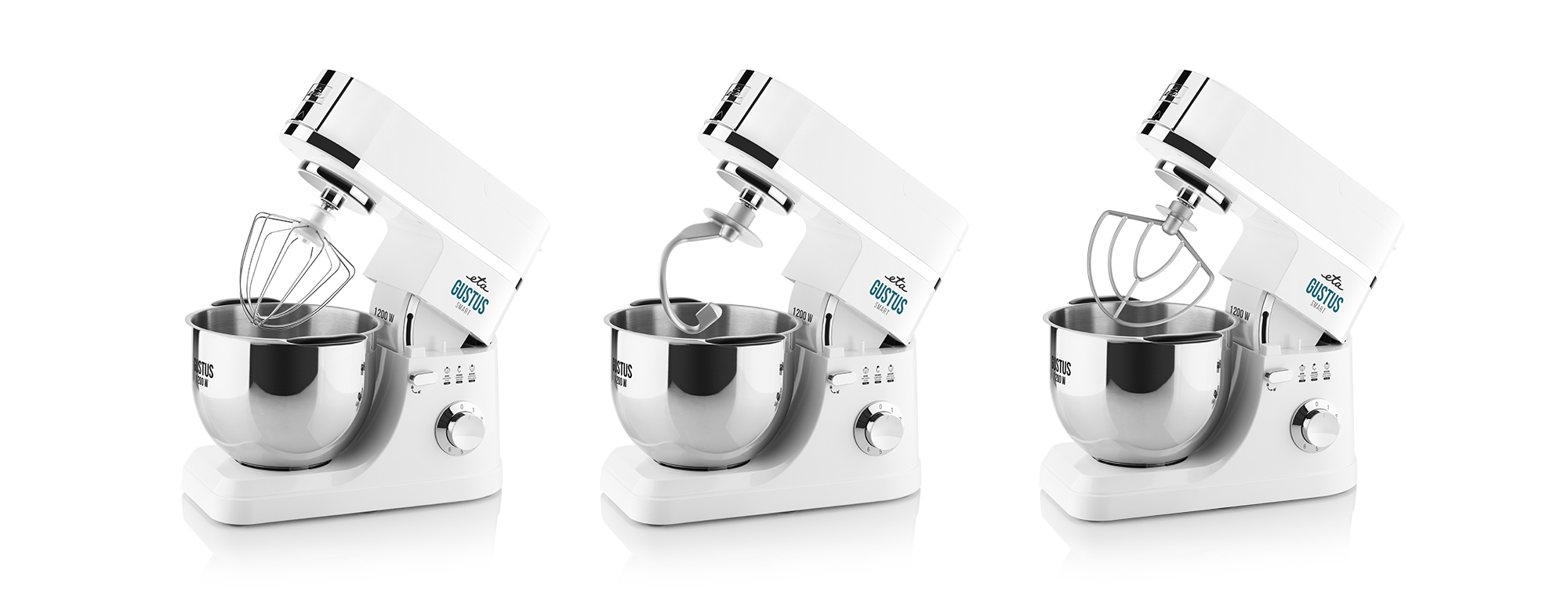 Robot ETA Gustus IV Smart je vybavený tromi druhmi metiel, vďaka ktorým sa môžete s námahou v kuchyni konečne rozlúčiť. Hnetací hák skvele poslúži pri príprave tuhých a kysnutých ciest, zatiaľ čo si miešacia metla poradí s tými ostatnými. Metla na šľahanie potom vyšľahá dokonale hladké krémy aj nadýchanú šľahačku.