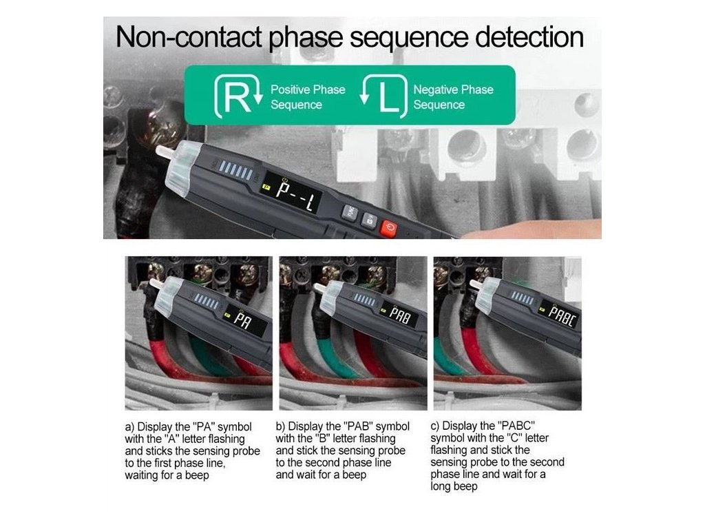 c) Zobrazte symbol "PABC" s blikajúcim písmenom "C" a priložte sondu na druhú fázu a čakajte na pípnutie a počkajte na dlhé pípnutie