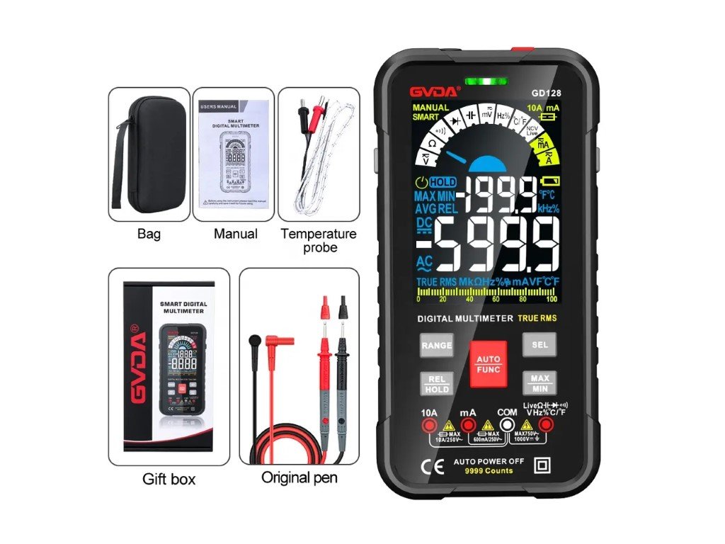 GVDA GD128 - Tento model je najpredávanejším tovarom na trhu, vďaka vysokej kvalite a špeciálnemu dizajnu. Dizajnom sa blíži mobilným telefónom. Snaží sa priblížiť meraciu techniku širšej verejnosti. Funkciami nabitý prístroj. GVDA Multimeter je profesionálny multimeter, ktorý dokáže merať striedavé a jednosmerné napätie, striedavý a jednosmerný prúd, odpor, kapacitu, kontinuitu, diódu, NCV atď.; Je to najlepšia voľba pre profesionálneho elektrikára, inžiniera, elektronického nadšenca alebo pre rodinné použitie. Ako špecialitu zobrazuje stav poistky. Napája sa s 3x AAA batériami (nie sú súčasťou balenia)