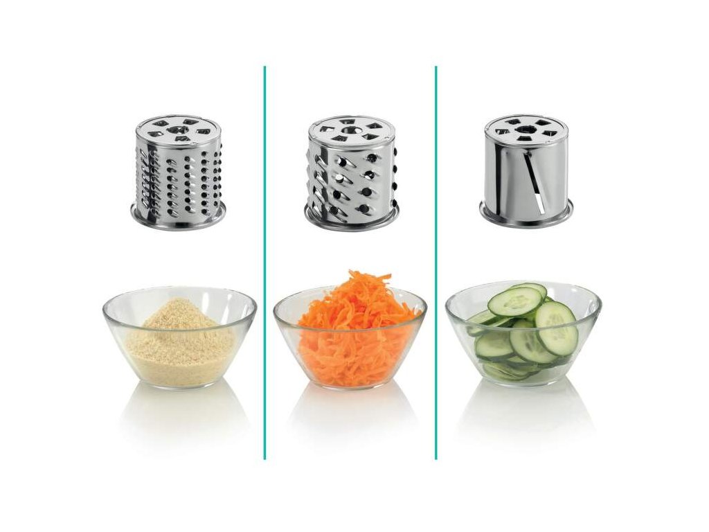 V príslušenstve nájdete nadstavce s rôznou hrubosťou na krájanie ovocia, zeleniny či iných surovín.