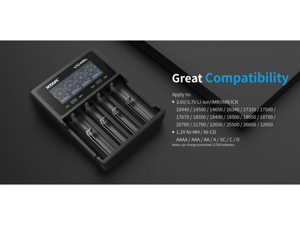 VC4SL je profesionálna procesorová nabíjačka s trojstupňovým nabíjacím procesom TC/CC/CV a AN LCD displejom. Nabíja 1-4 Li-ion články 3,6 / 3,7 V a Ni-MH ľubovoľnej kapacity vo veľkostiach AAA/R03, AA/R6, R14/C, D, 10440, 14500, 14650, 16340, 17500, 17650, 18350. 18500, 18650, 18700, 20700, 21700, 22650, 25500, 26650, 32650. Vrátane chránených batérií 20700 a 21700