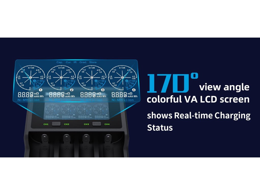 - VA LCD displej informujúci o kapacite nabíjania, napätí článku, nabíjacom prúde a vnútornom odpore článku