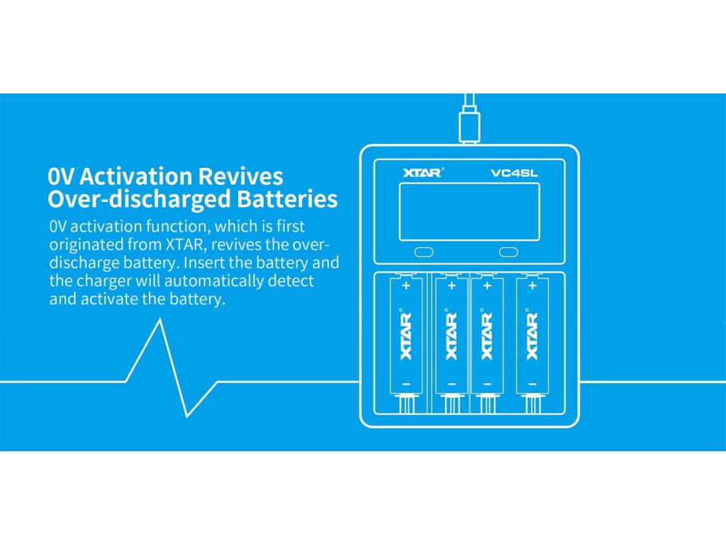 Nabité batérie ponechané v nabíjačke prejdú prirodzeným samovybíjacím procesom. Nabíjanie sa obnoví, keď napätie na batérii klesne pod 3,9V. Xtar VC4SL nabíjačka má funkciu reaktivácie hlbokom vybití bunky a bunky s napätím 0V. Mnohé nabíjačky na trhu nie sú schopné takéto batérie nabíjať. Práve tu prichádza vhod nabíjačka Xtar VC4SL , ktorá v mnohých prípadoch umožňuje 'záchranu' takýchto článkov. Hlboko vybitú batériu stačí vložiť do nabíjačky VC4SL ako pri bežnom nabíjaní - nabíjačka zaznamená vybitý článok a pokúsi sa ho znovu aktivovať.