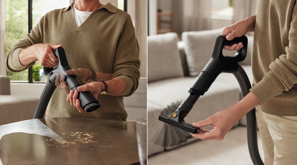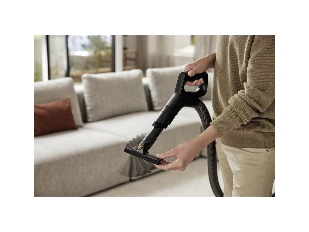 Rukoväť Comfort je navrhnutá s dôrazom na pohodlie a efektivitu pri upratovaní. Vďaka premyslenému ergonomickému tvaru skvele padne do ruky, čím znižuje námahu pri dlhšom vysávaní. Integrovaný sací štetec je vždy po ruke a umožňuje okamžité použitie – ideálny na rýchle a šetrné odstránenie prachu z citlivých povrchov alebo ťažko prístupných miest.