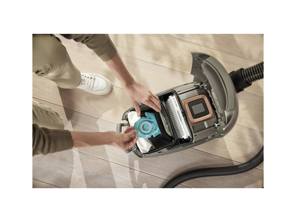 Pokročilá filtračná technológia a špeciálne prachové vrecká umožnia, že si môžete užívať vysokú úroveň hygieny vo vašej domácnosti s filtračnou účinnosťou 99,99 %. Systém ComfortFit zaisťuje ľahké vkladanie prachových vreciek a bezpečné uzavretie, ktoré zabraňuje úniku prachu a robí výmenu vrecka mimoriadne hygienickou. Nové prachové vrecká sú navyše vyrobené viac ako z 80 % z recyklovaných materiálov.