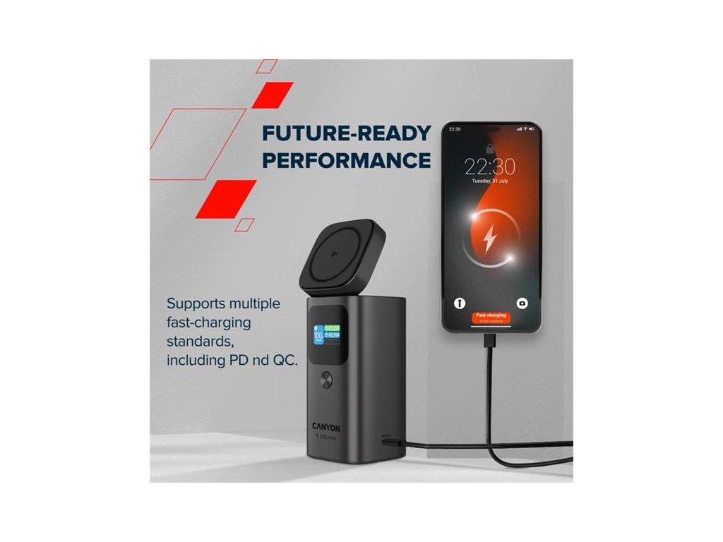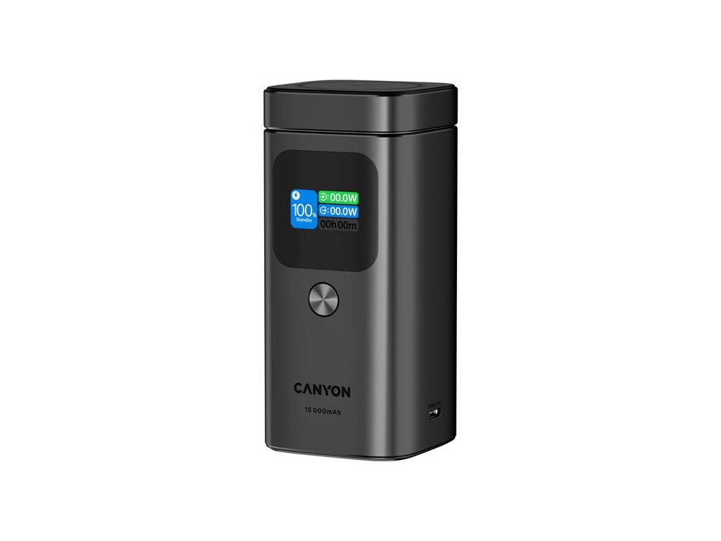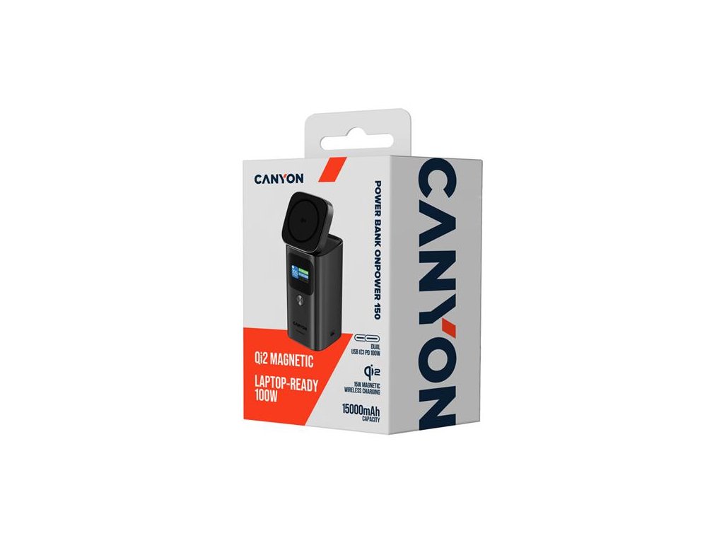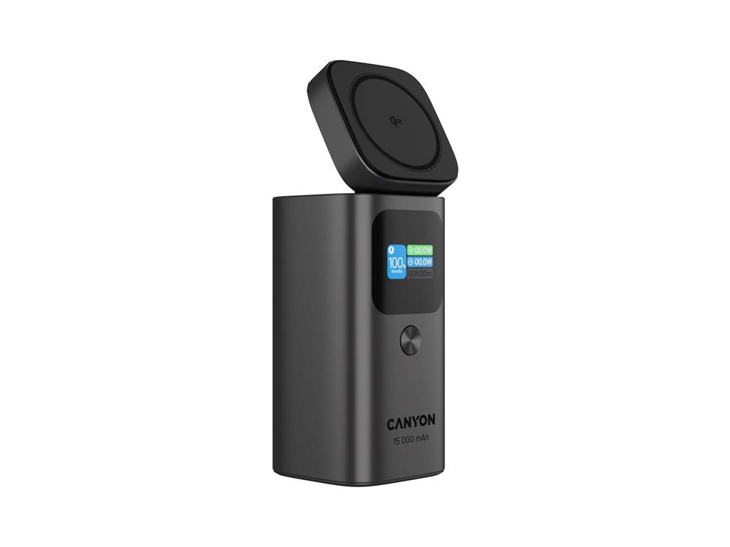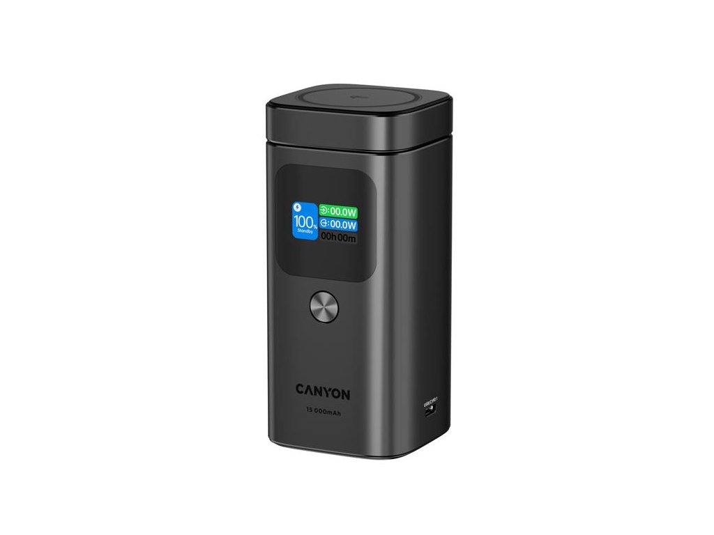 Canyon OnPower 150, Powerbank, 15.000 mAh, 100W, displej, in:USB-C, out:2x USB-C/1xUSB-A, Qi2 bezdr. nabíjanie
