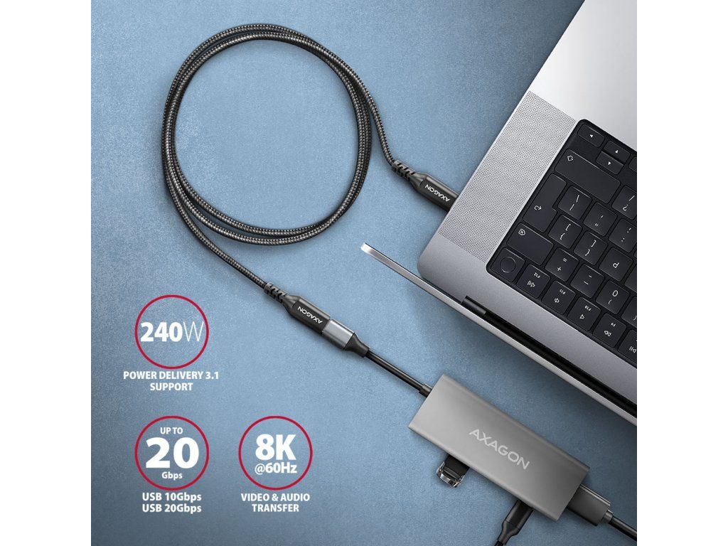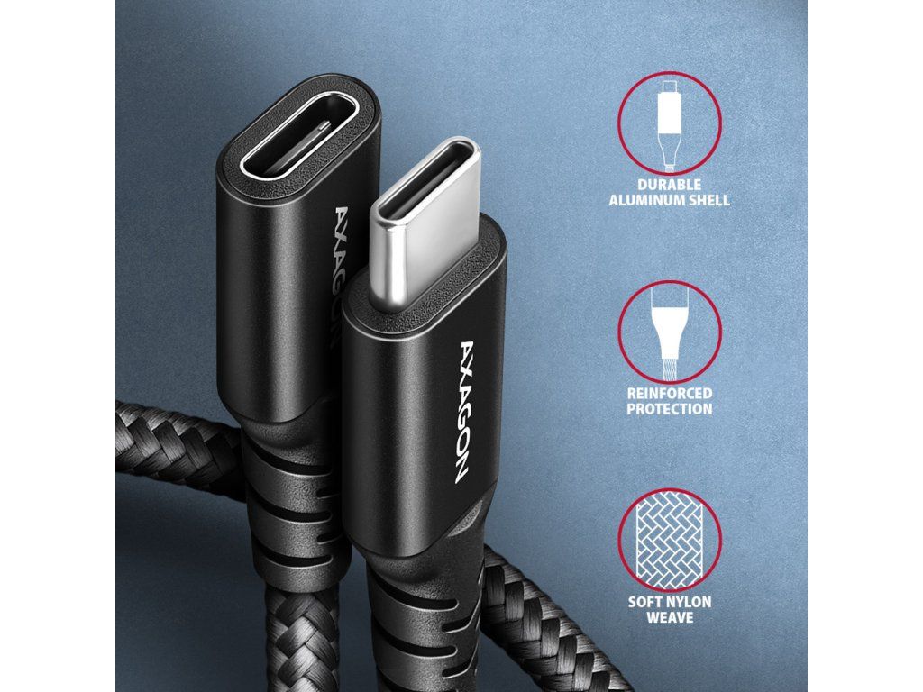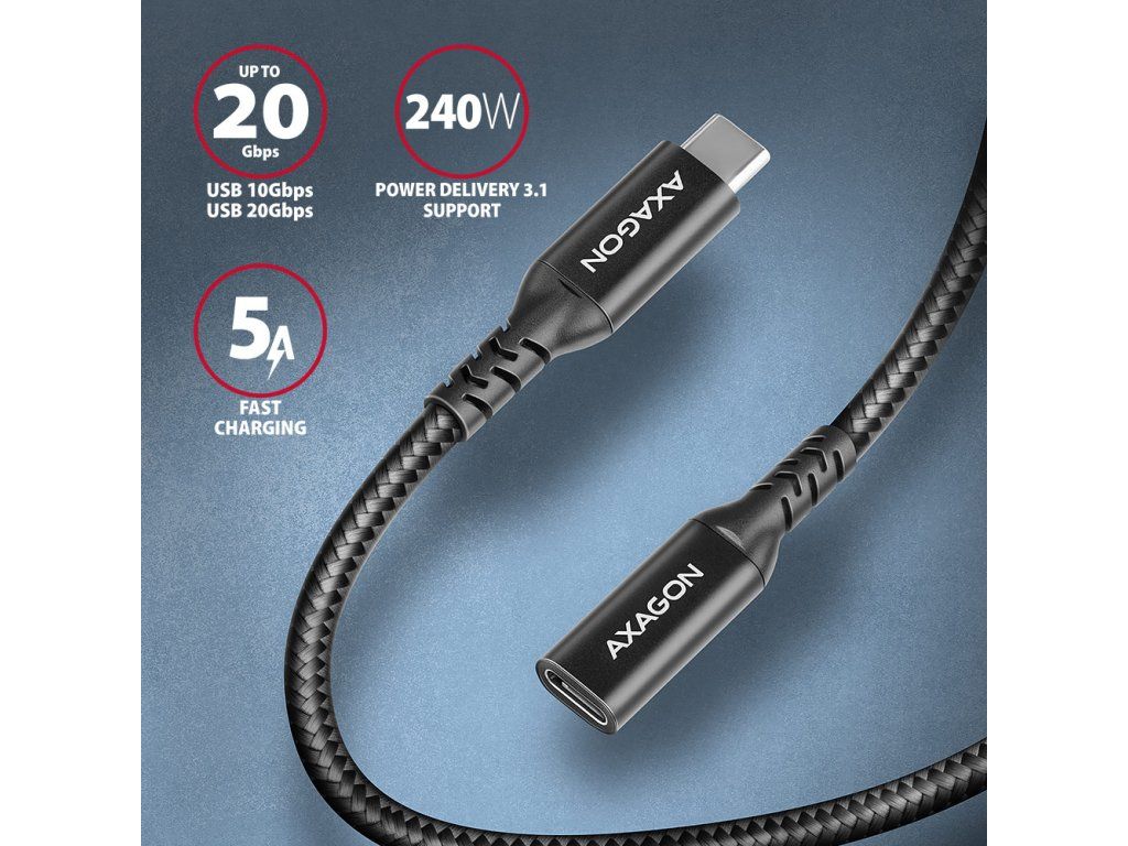 Axagon USB-C(M) na USB-C(F) 1m 240W 3A 8KHD čierny Kábel