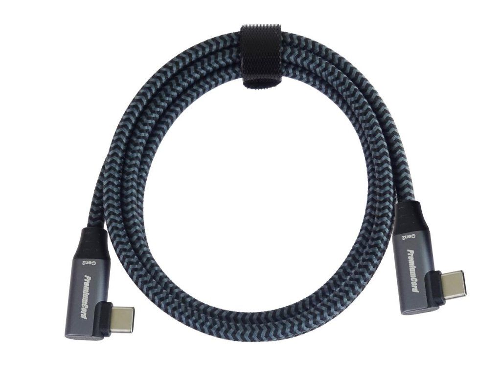 PremiumCord USB-C 2x zahnutý 90° kabel ( USB 3.2 GEN 2x2, 5A, 100W, 20Gbit/s ) hliníkové krytky konektorů, bavlněný oplet, 1m