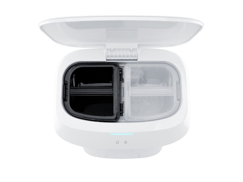 Snadná údržba – stanice má dvě vyjímatelné velké nádoby na vodu: 3,3 l na čistou a 3,7 l na špinavou vodu. Dostatečná kapacita snižuje potřebu častého doplňování nebo vylévání, a tím šetří čas i starosti. Do nádoby na čistou vodu se nesmí nalévat žádný čisticí prostředek, ten je dávkován automaticky z dávkovače.
