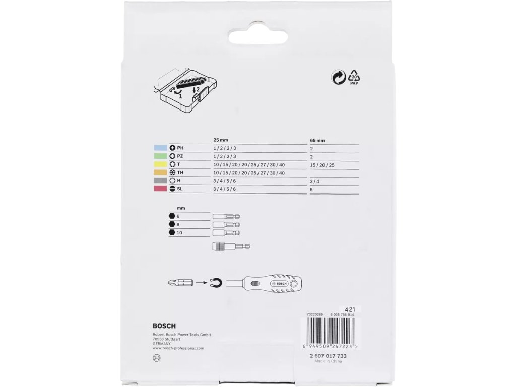 PH1, PH2 (2x), PH3 / PZ1, PZ2 (2x), PZ3 / SL3, SL4, SL5, SL6 / HEX3, HEX4, HEX5, HEX6 / T10, T15, T20 (2x), T25, T27, T30, T40 / TH10, TH15, TH20 (2x), TH25, TH27, TH30, TH40 / PH2 / PZ2 / S6 / H3, H4 / T15, T20, T25 / Násuvný kľúč 6/8/10 mm / Univerzálny držiak Quick Release / Ručný skrutkovač