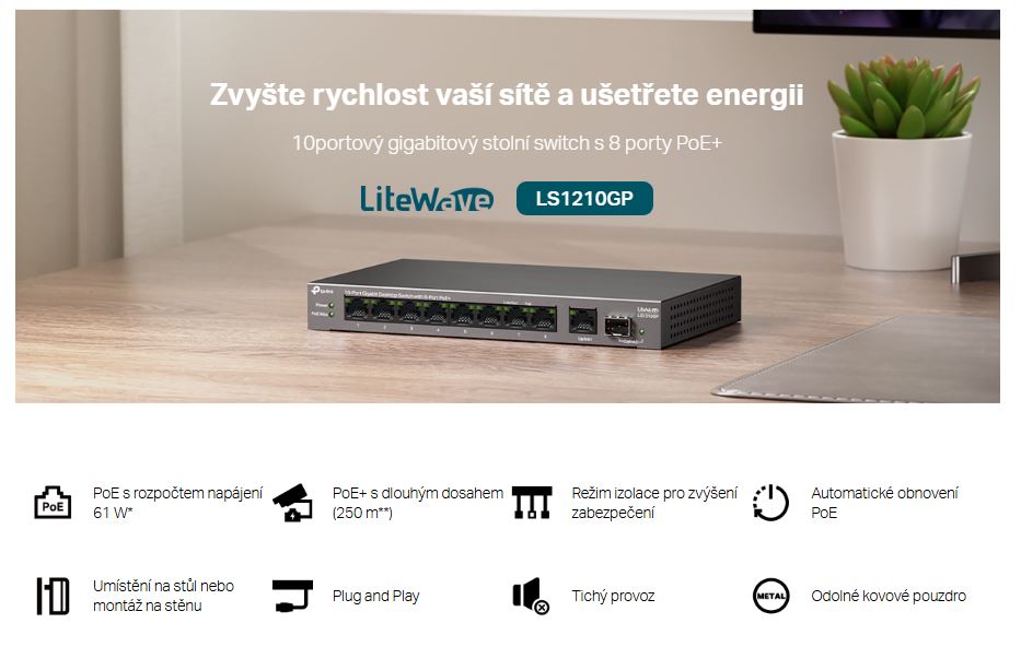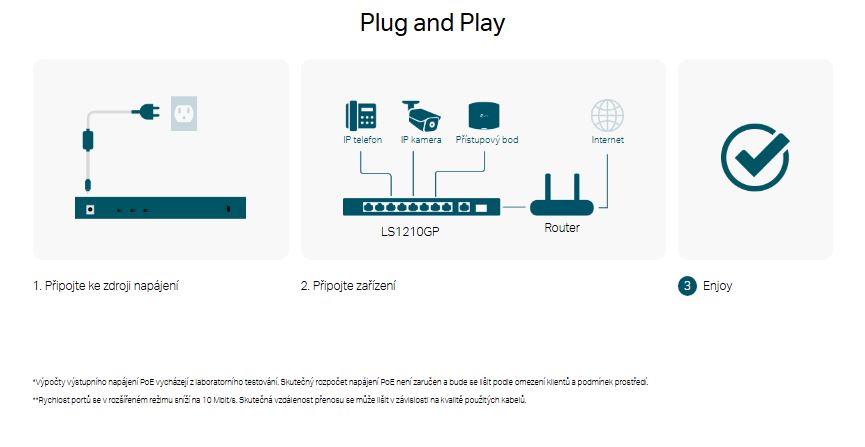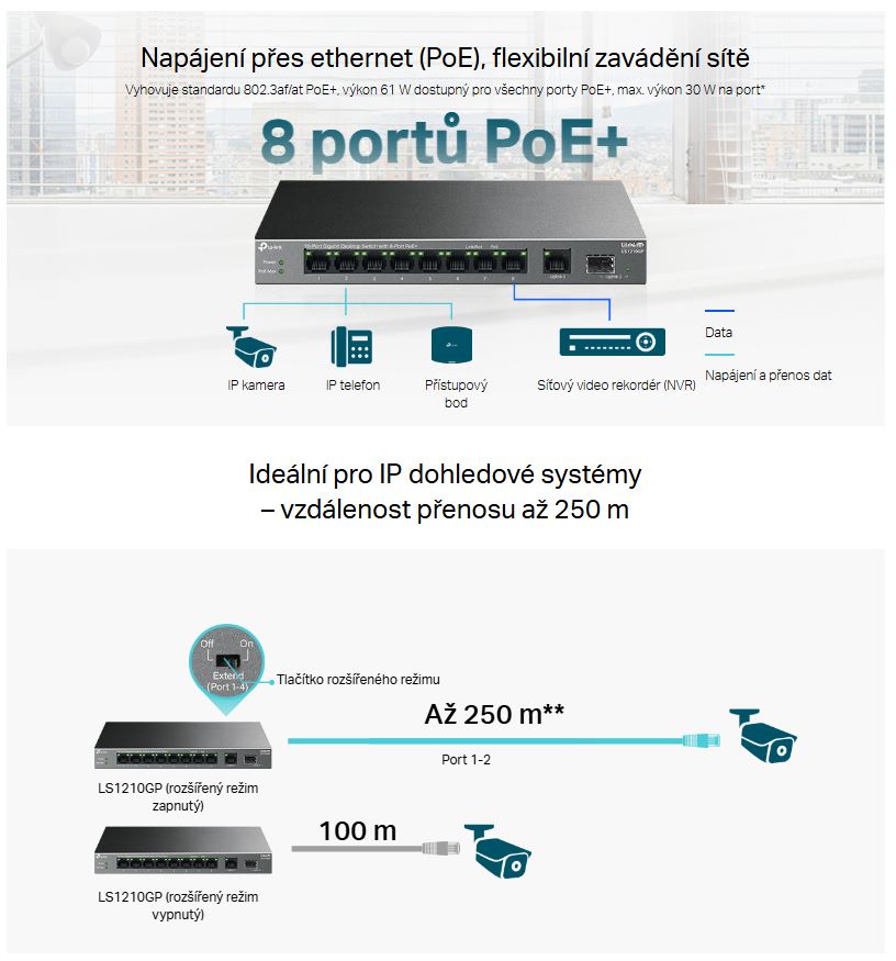- PoE s rozpočtem napájení 61 W: Osm gigabitových portů PoE+ kompatibilních se standardem 802.3af/at umožňuje snadné připojení a napájení pevně připojených zařízení, jako jsou IP kamery, přístupové body a IP telefony, a to prostřednictvím jediného kabelu. Výstupní napájení PoE o výkonu až 30 W je podporováno na každém portu PoE.*