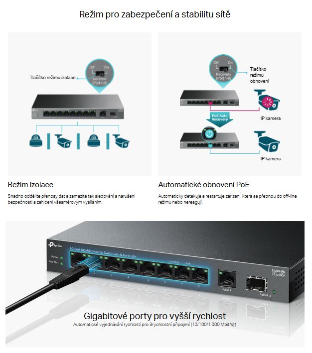 - Automatické obnovení PoE: Funkce automatického obnovení vypadlých nebo nereagujících zařízení napájených přes PoE.