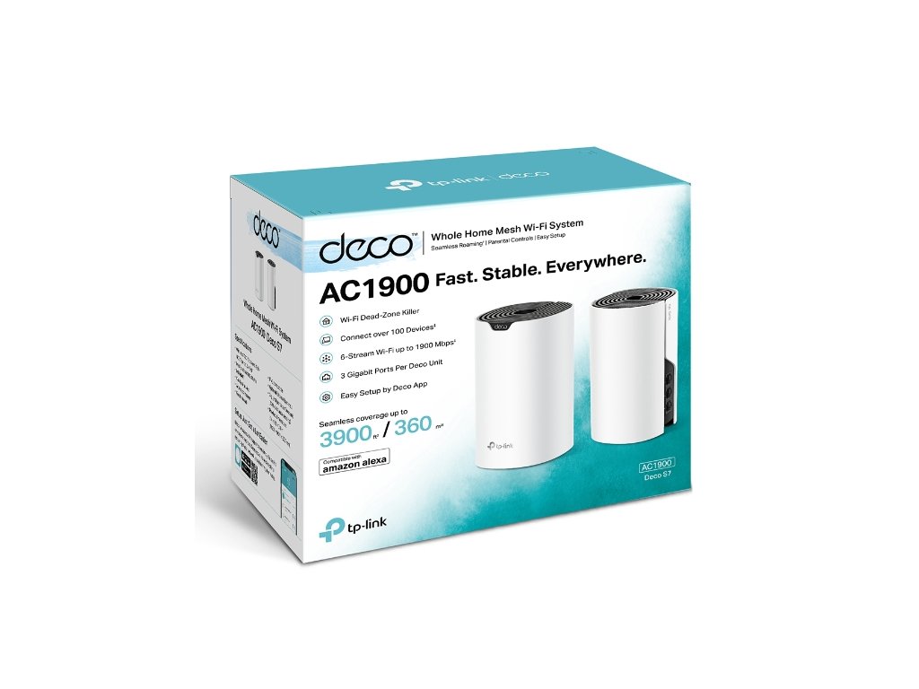 Deco S7 je výkonný Mesh systém AC1900 s Wi-Fi pre celoplošné pokrytie domácnosti. Deco S7 ponúka jednoduchý spôsob, ako zaistiť silný WiFi signál v každom rohu vášho domu, na ploche až 195 m2 (sada s 1 jednotkou). Bezdrôtové pripojenia a voliteľné chrbticové ethernetové pripojenie pracujú spoločne na prepojení jednotiek Deco, vďaka čomu bude vaša sieť rýchlejšia a zaistí neprerušované pripojenie všetkých zariadení.