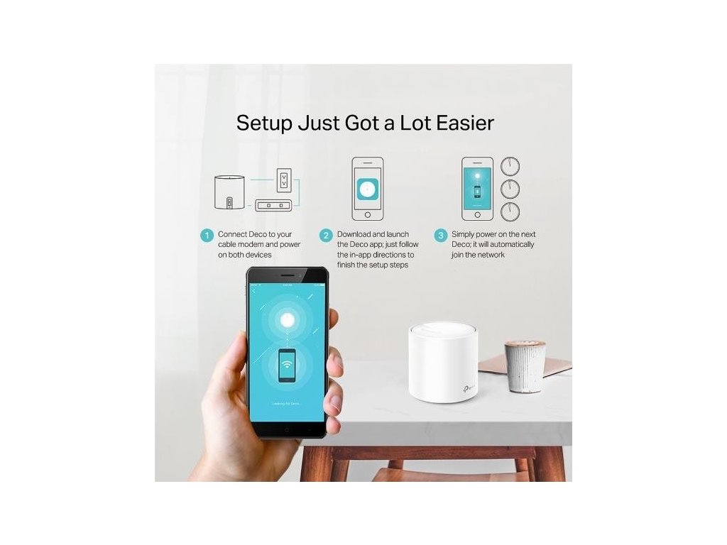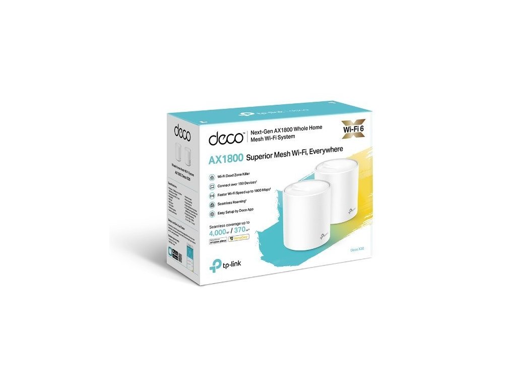 Koncept Deco (dvojpásmové zariadenia, frekvencia 2.4 a 5 GHz, podporované štandardy IEEE 802.11 ax / ac / n / a 5 GHz, IEEE 802.11 ax / n / g / b 2.4 GHz; prenosová rýchlosť 1201 a 574 Mbps) zabezpečí bezproblémové pokrytie signálom, s technológiou Deco Mesh jednotky vzájomne spolupracujú a vytvárajú jednu zjednotenú sieť; 2 jednotky pokryjú signálom asi 370 m2. Podporované technológie: MU-MIMO, OFDM, 1024-QAM, BSS Color, Auto Path Selection, Self-Healing, AP Steering, Band Steering, Beamforming. Rozhranie: 2 x LAN / WAN gigabitový ethernetový port, 4 x interná anténa na jednotku.