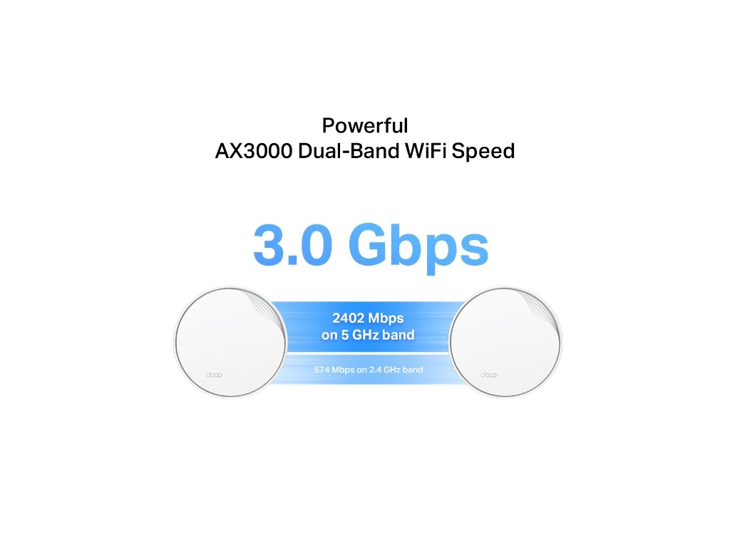 WiFi router Deco X50-PoE značky TP-Link vám poskytne výkonné dvojpásmové WiFi pripojenie. Rýchlosť siete siaha v 5 GHz pásme až k 2402 Mbps. Na routeri navyše nájdete 2,5 gigabitový ethernetový port, s ktorým ešte viac zrýchlite WiFi. Zaistite si perfektné podmienky pre náročné pracovné úlohy na počítači, cloudové hranie a sledovanie 8K videí.